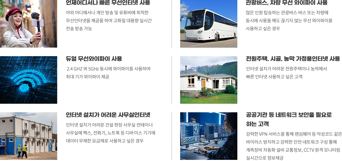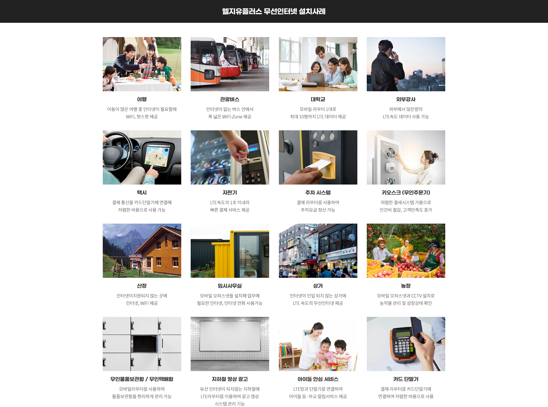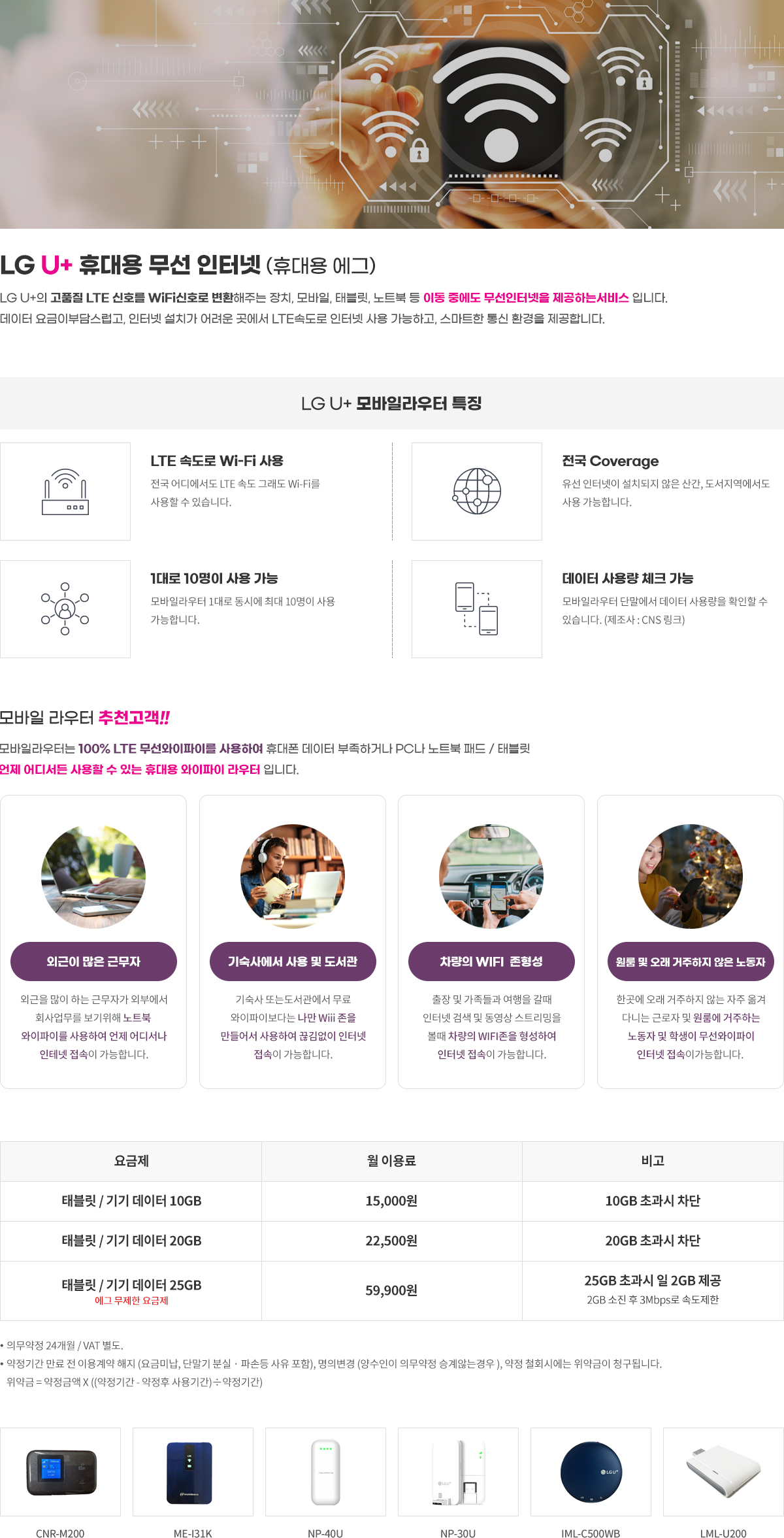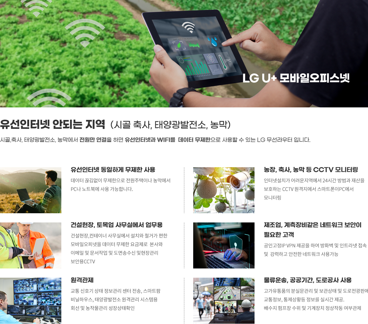 전국어디서나 인터넷설치가 어려운곳에 LGU+ 고품질의 LTE 신호를 WIFI나 유선인터넷 변환해주는 장치이며 , 모바일,테블릿 , 노트북, 산업현장에서 무선인터넷을 제공하는 서비스 입니다.